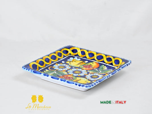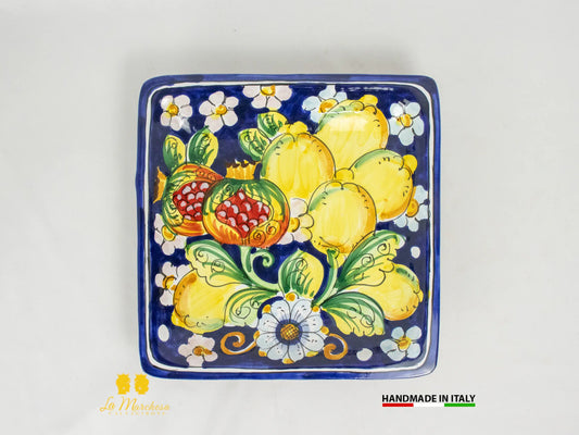 Piatto in ceramica di Caltagirone quadrato blu cobalto limoni 25cm