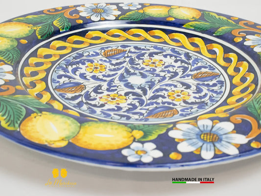 Piatto in Ceramica di Caltagirone blu cobalto limoni melograni 37cm