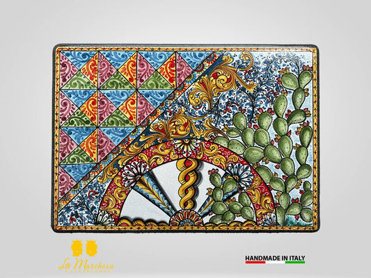 Centrotavola in Ceramica di Caltagirone con manici carretto intagli 32cm