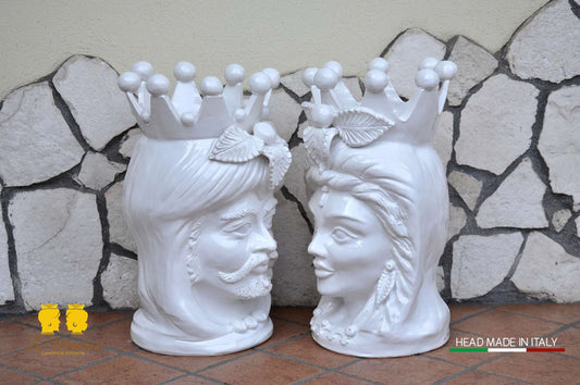 Coppia Teste di Moro in ceramica Caltagirone barocco bianco H48