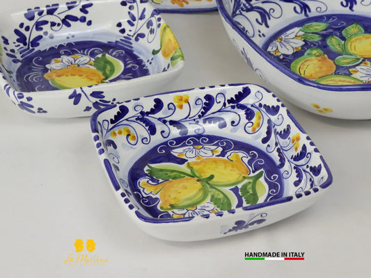 Ciotola decorata in Ceramica di Caltagirone quadrata Blu cobalto limoni 20cm