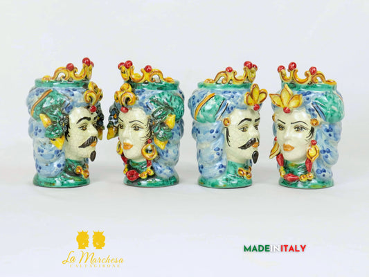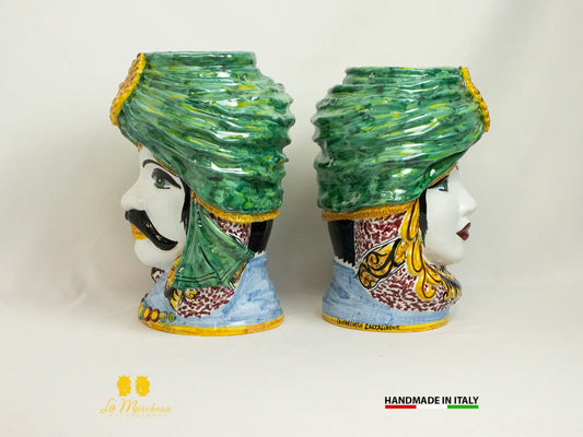 Teste di Moro in Ceramica Caltagirone Ornato Verde Rame Celeste - Varie Misure