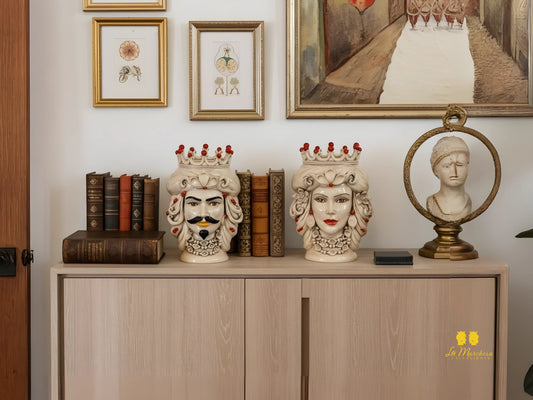 Coppia Teste di moro in Ceramica di Caltagirone fumè corona rossa 43cm