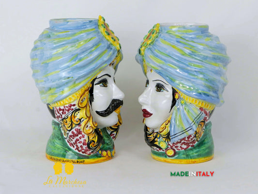 Teste di Moro in Ceramica di Caltagirone turbante celeste 23cm
