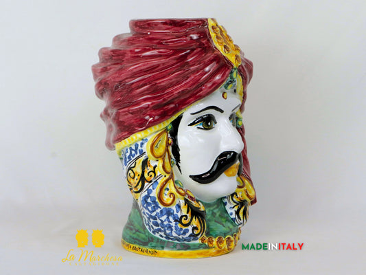 Testa di Moro uomo in Ceramica di Caltagirone turbante bordeaux spilla 26cm