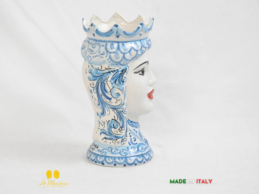 Testa di Moro in Ceramica di Caltagirone Donna bianco blu antico 26cm