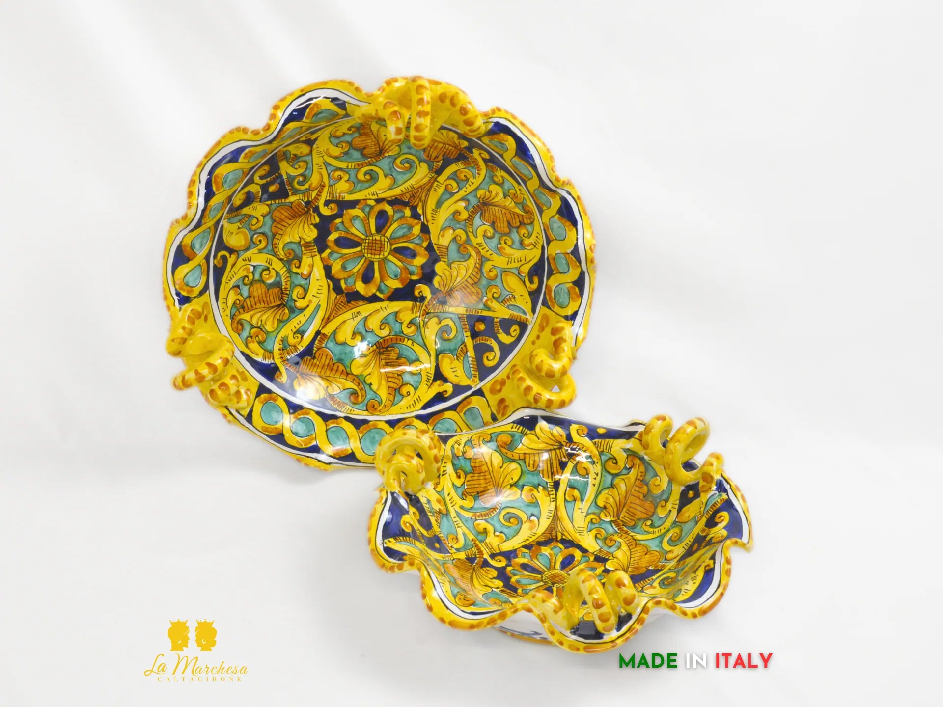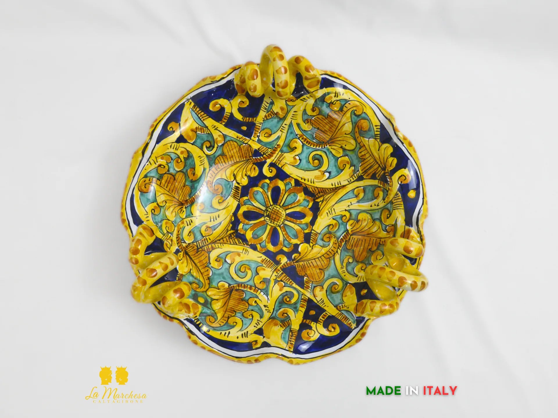 Ciotola Svuotatasche ingresso o Centrotavola co manici in Ceramica di Caltagirone con manici. Realizzato a mano e decorato interamente a mano. La forma quasi rotonda è resa più particolare da un bordo leggermente arricciato e dei manici intrecciati, fatti a mano. All'interno della ciotola svuotatasche un tradizionale decoro calatino barocco con motivi floreali giallo oro su fondo blu cobalto e verde.