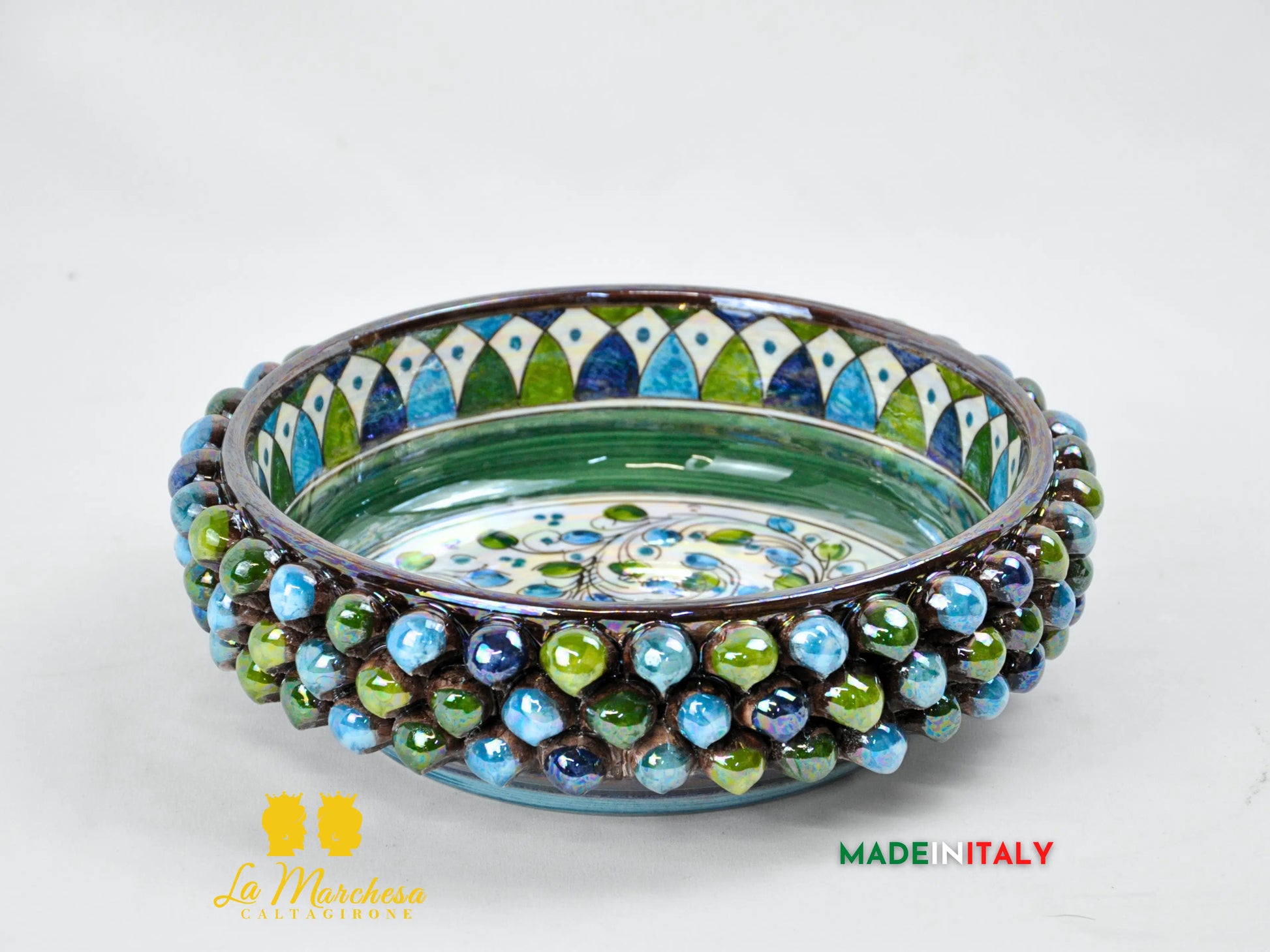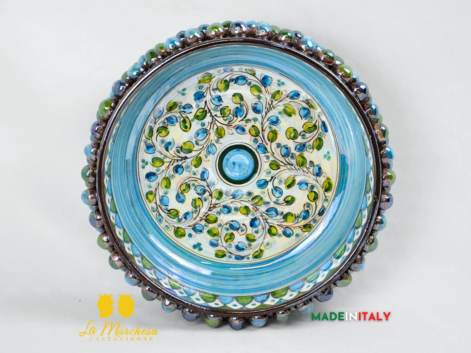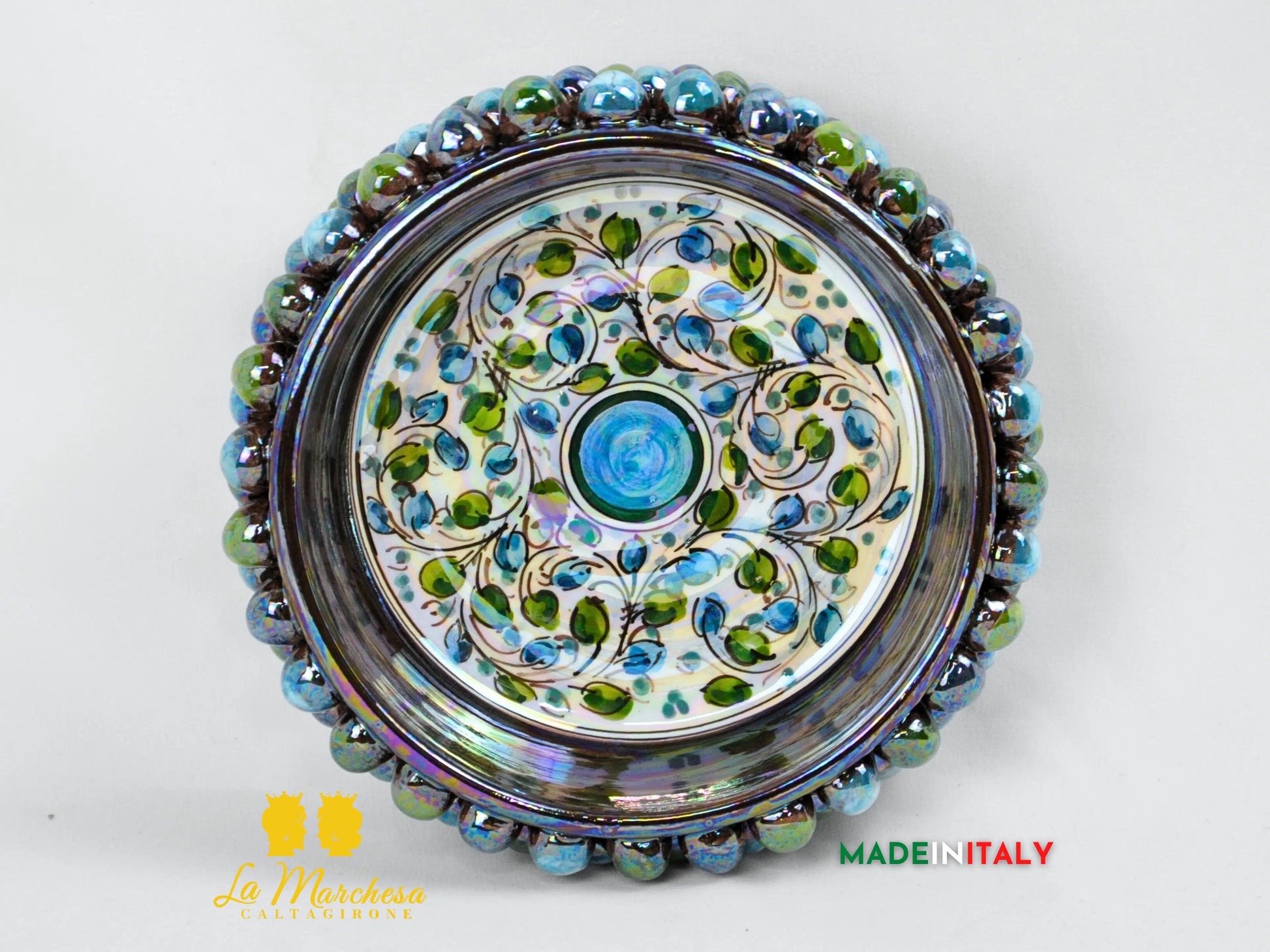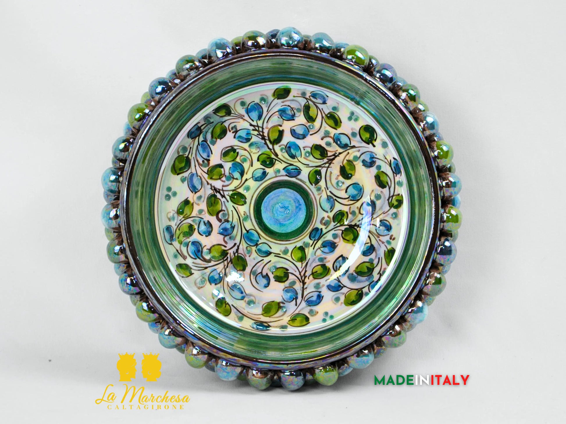 Il decoro centrale, finemente eseguito a pennello, presenta motivi floreali e ramage nei toni del verde e del blu, che evocano la freschezza della natura siciliana. Il bordo è arricchito da una preziosa applicazione di chicchi di pigna — simbolo di prosperità e buon augurio — realizzati uno ad uno e smaltati in sfumature madreperlacee che riflettono la luce con cangianti effetti iridescenti.
