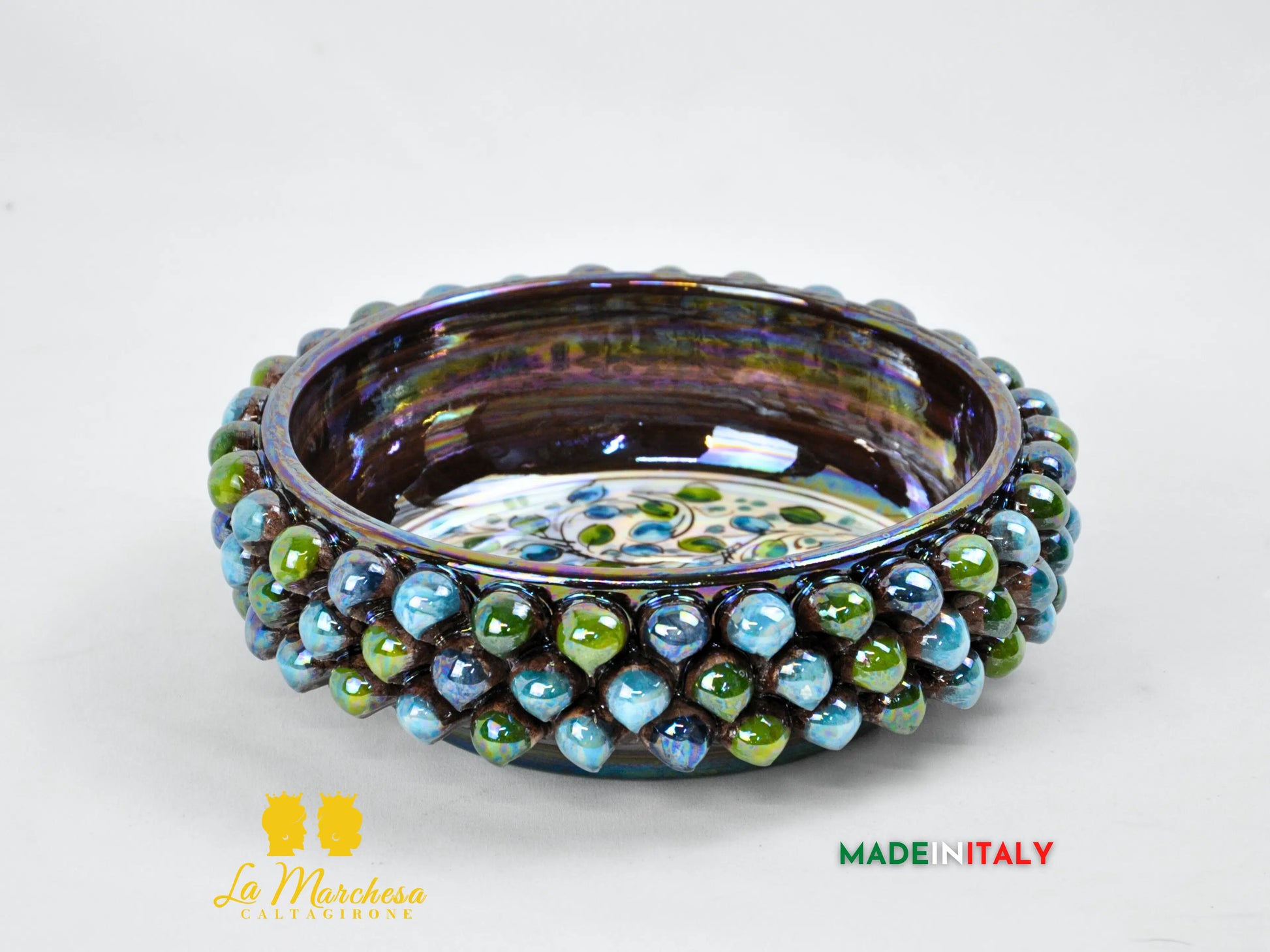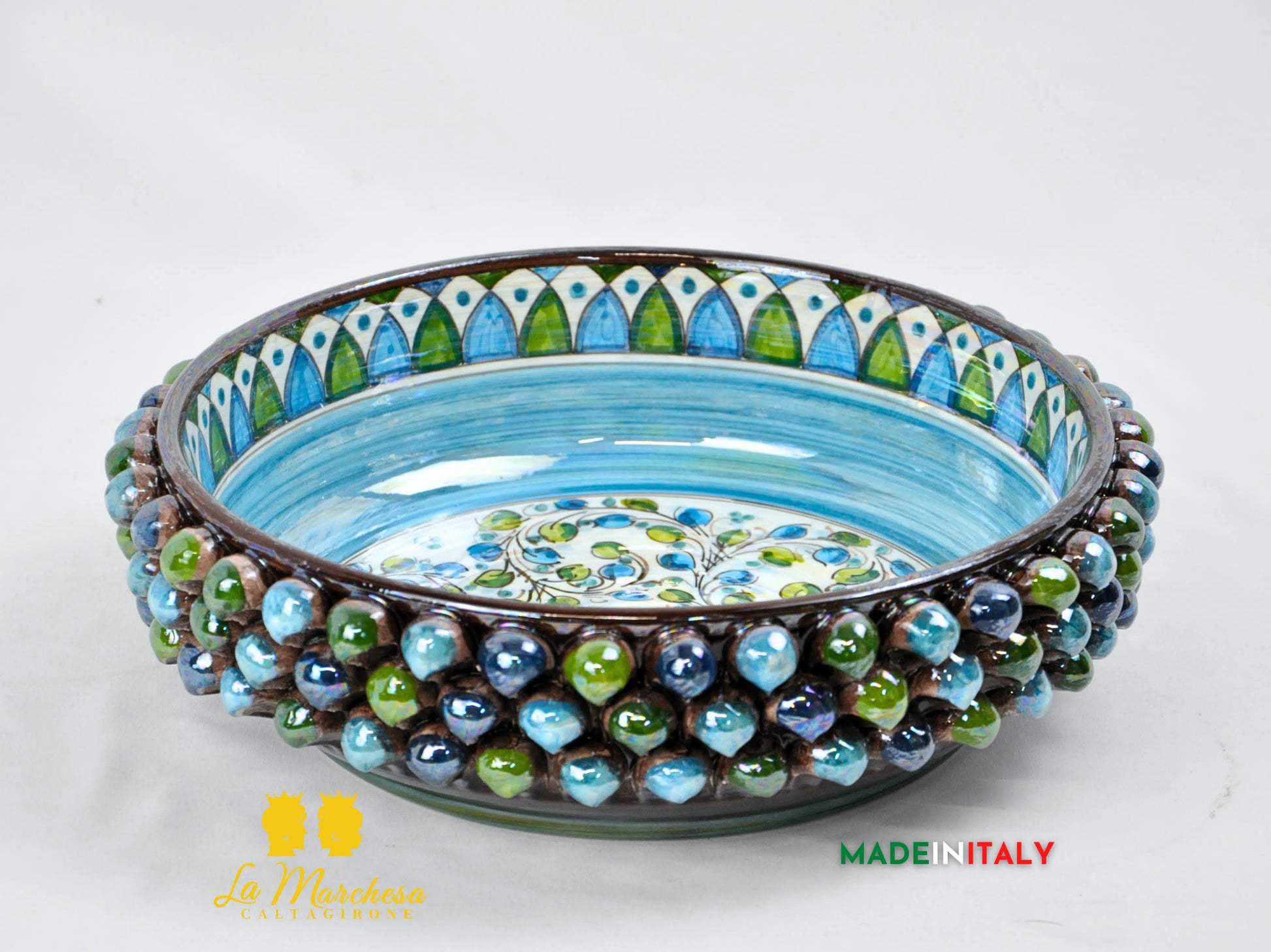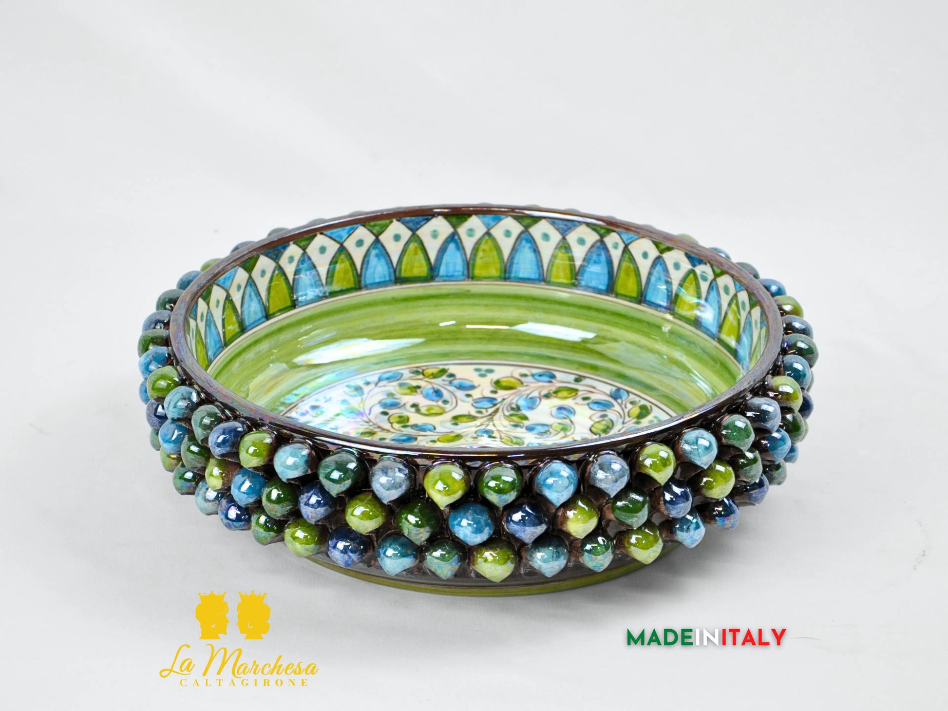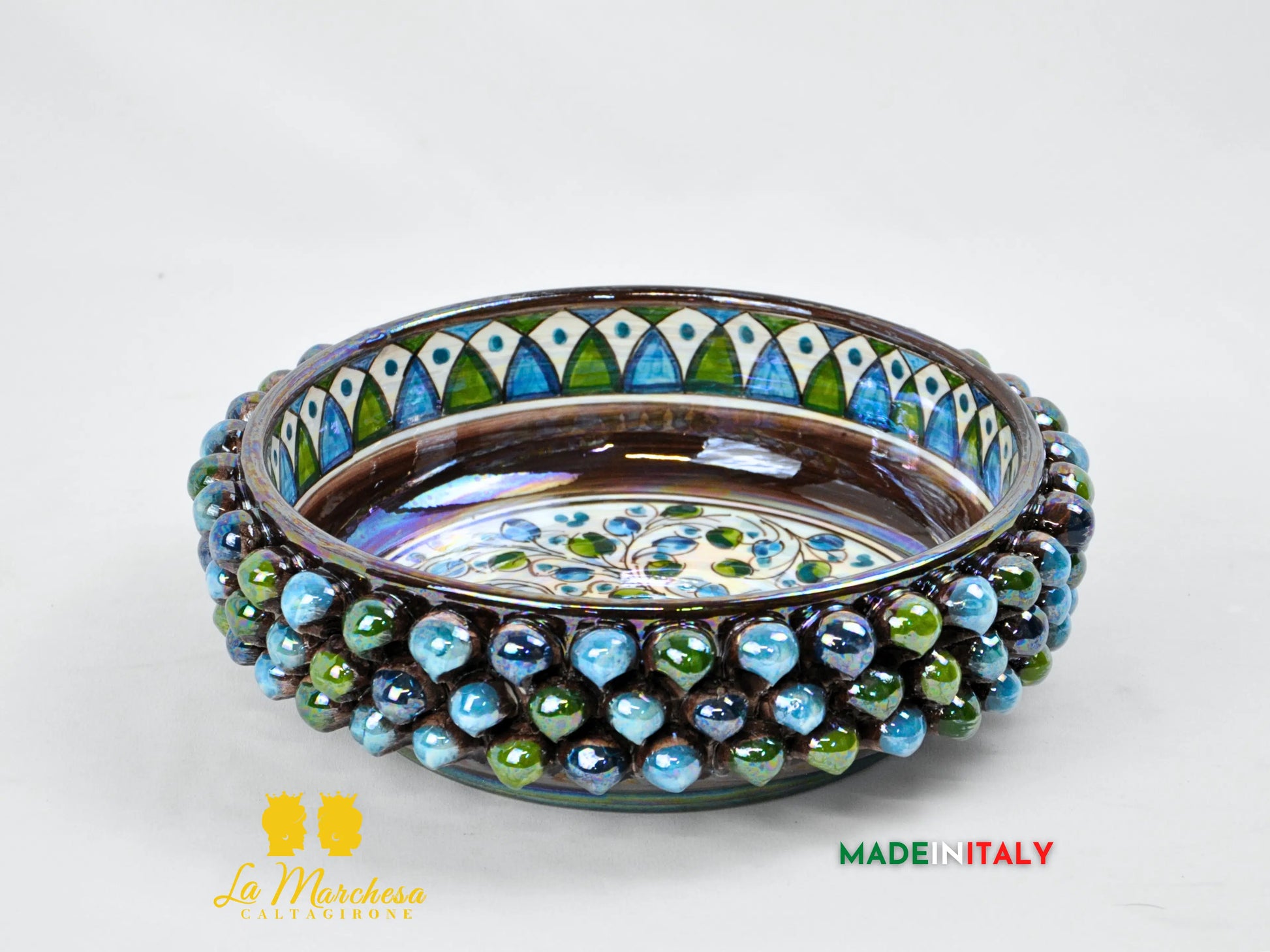 Il decoro centrale, finemente eseguito a pennello, presenta motivi floreali e ramage nei toni del verde e del blu, che evocano la freschezza della natura siciliana. Il bordo è arricchito da una preziosa applicazione di chicchi di pigna — simbolo di prosperità e buon augurio — realizzati uno ad uno e smaltati in sfumature madreperlacee che riflettono la luce con cangianti effetti iridescenti.
