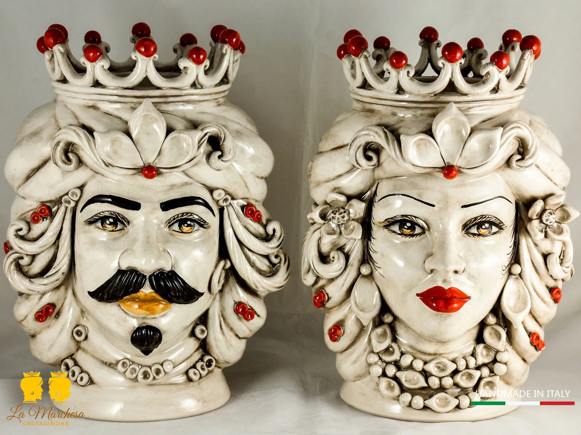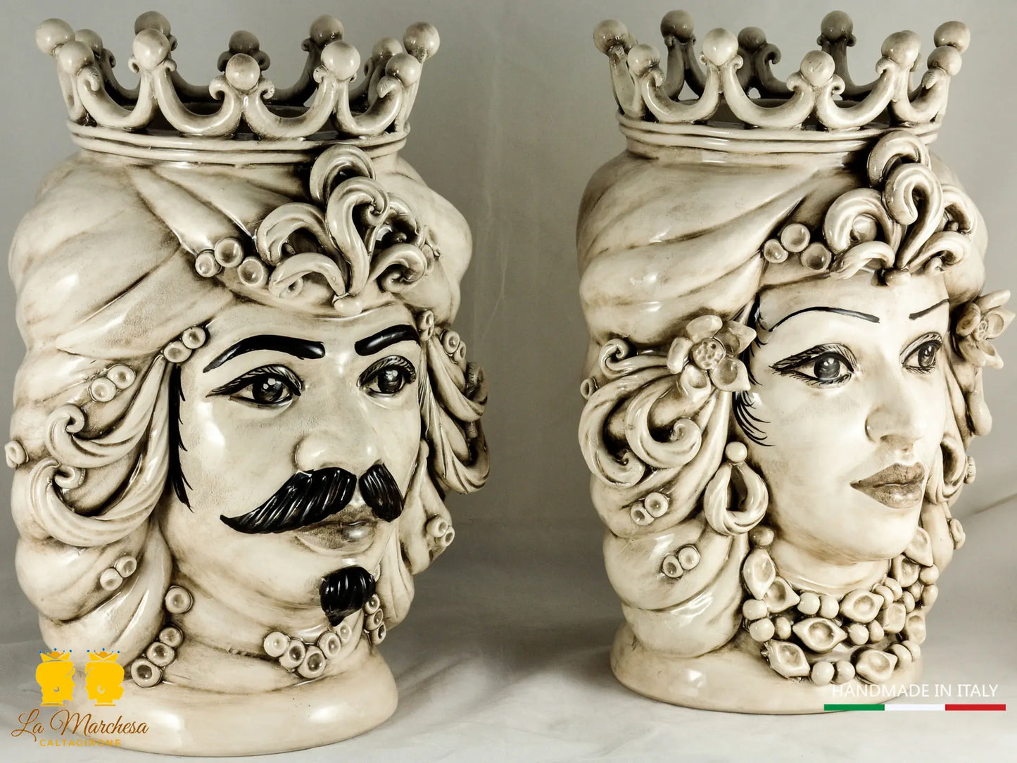 Tradizionale e pregiata Coppia di Teste di Moro in ceramica di Caltagirone. Arricchita da applicazioni barocche. Interamente realizzate a mano e decorate a mano, impreziosite da smalto lucido in simil Cristallo con effetto fumè. Questo modello, fra i più venduti della linea La Marchesa Caltagirone, si caratterizza per le eleganti applicazioni create a mano, con foglie e ghirigori sulla fronte, ai lati del volto e sul collo.