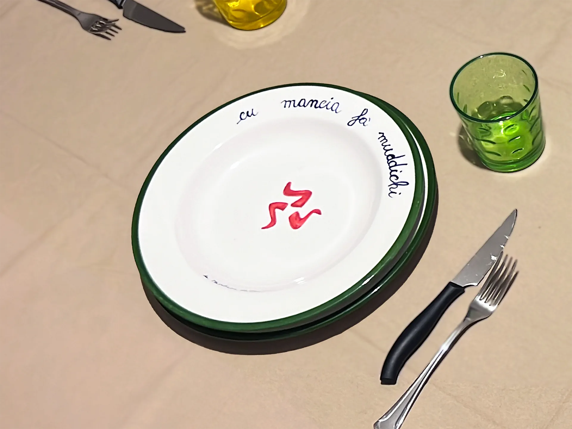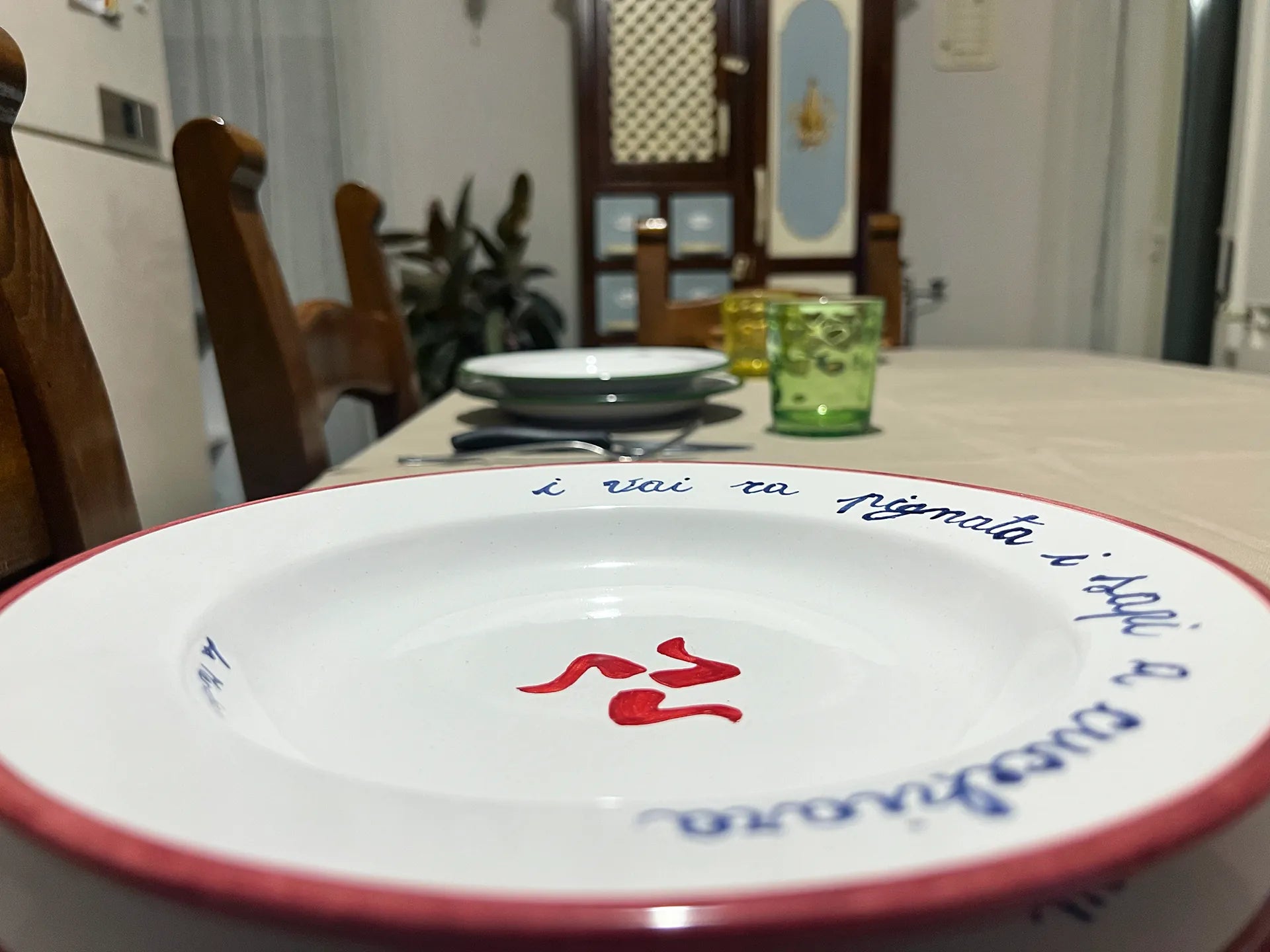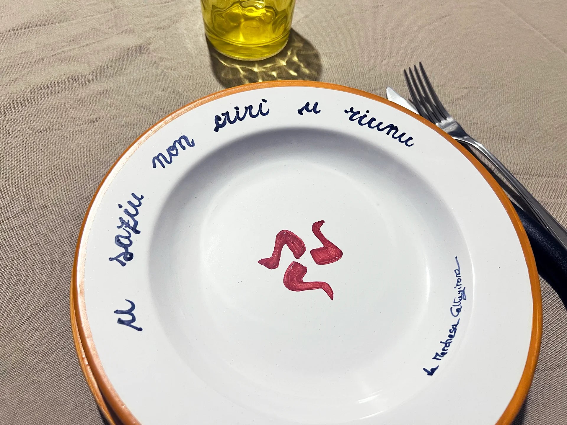 Piatto in Ceramica di Caltagirone, interamente formato e decorato a mano. Questi piatti molto caratteristici e simpatici sono fatti con una base bianca con al centro una trinacria stilizzata con le sole gambe. Sul bordo del piatto è decorato con una linea colorata e una scritta una frase ispirata ai detti siciliani che hanno a che fare con il cibo e la cucina. Spesso queste frasi sono detto in modo ironico, ma comunque nascono dalla saggezza popolare che ci insegna verità profonde.