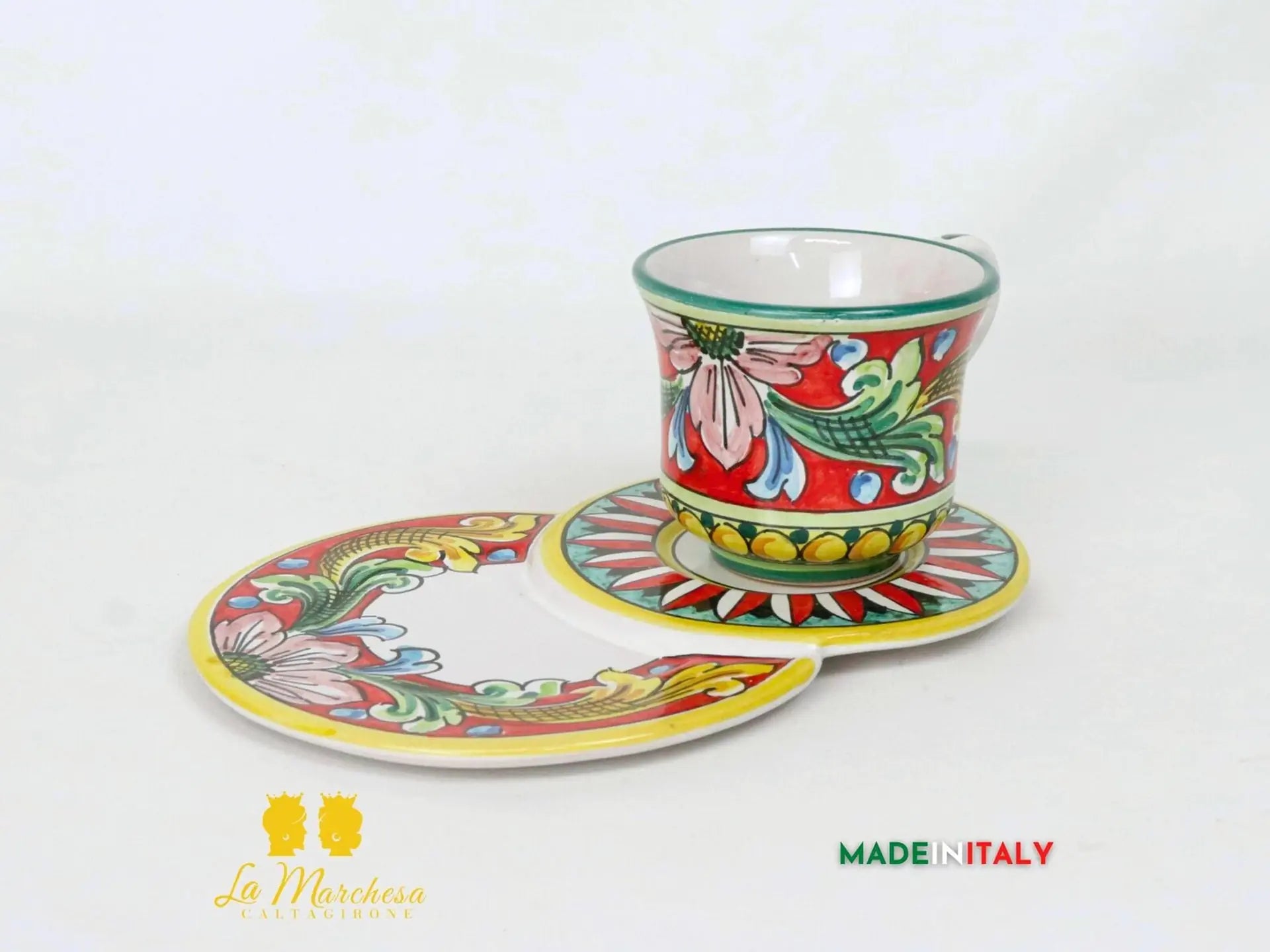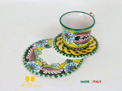 Raffinata Tazza da latte, thè o cappuccino con piattino porta biscotti in ceramica di Caltagirone, realizzata a mano e decorata interamente a mano. Decorate con i decori tradizionali siciliani.