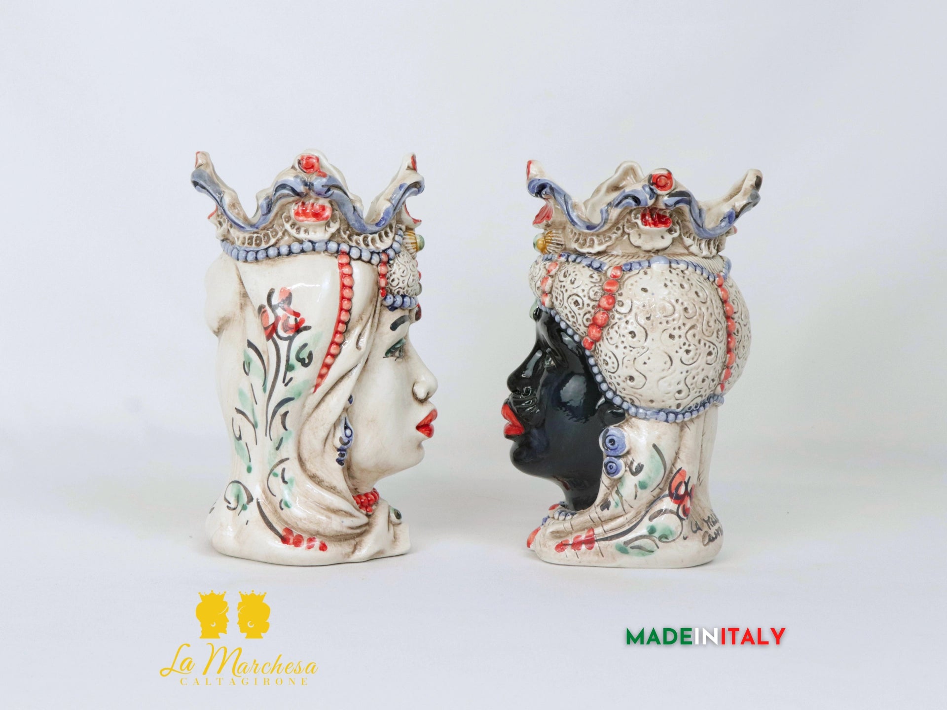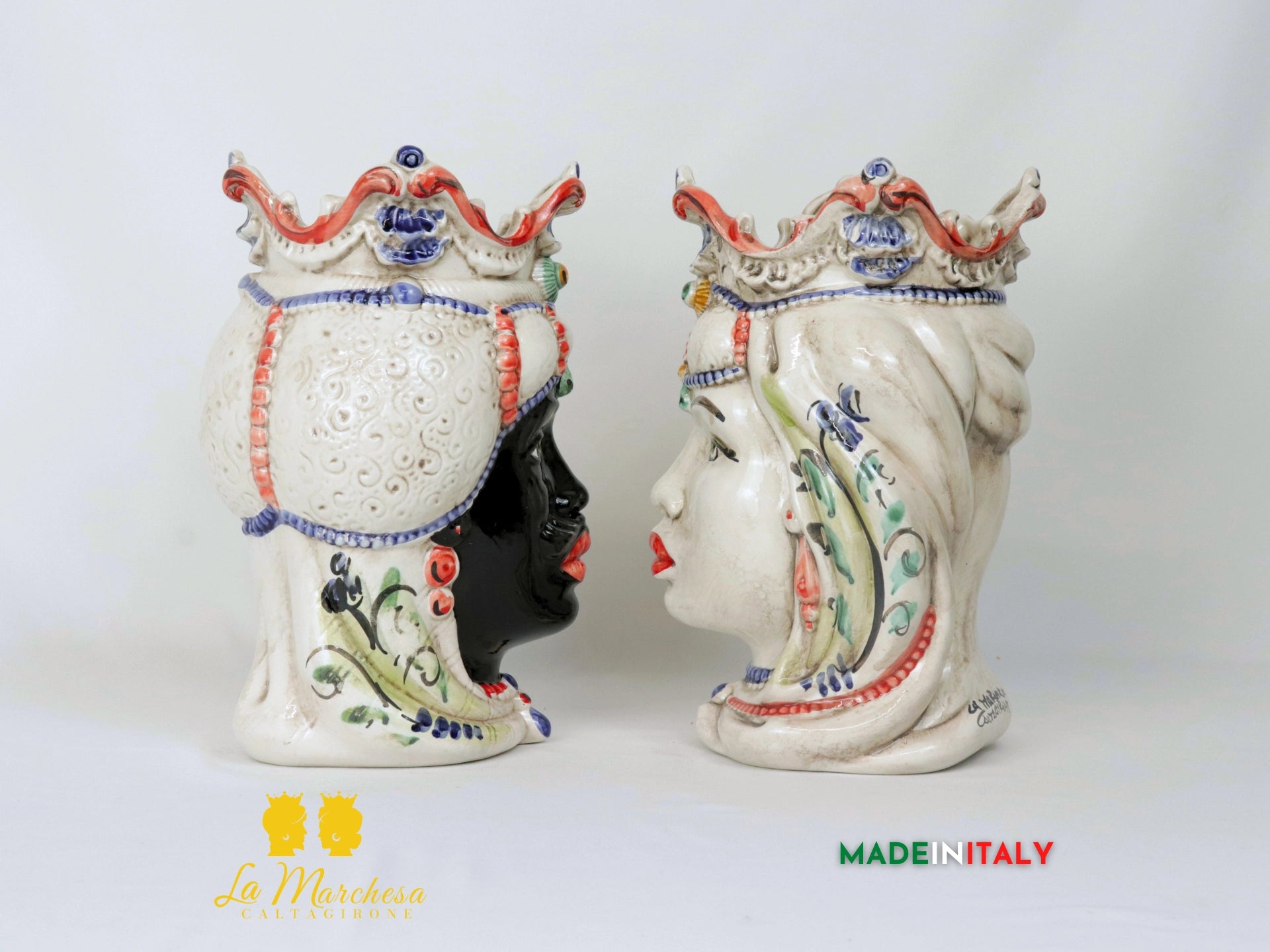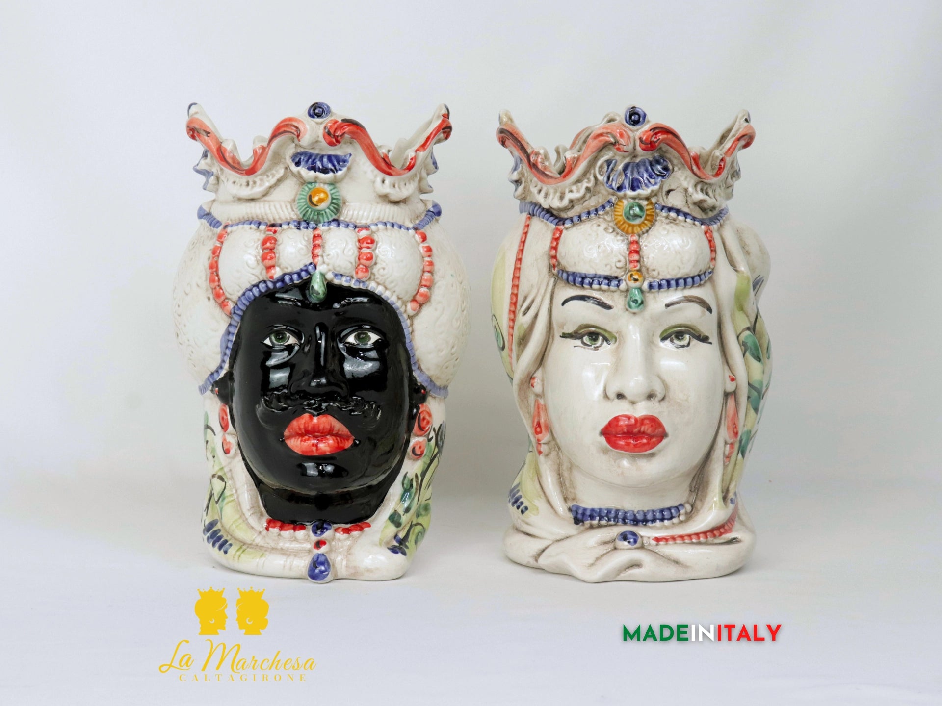 Teste di Moro in Ceramica di Caltagirone con corona e turbante barocchi. Le due Teste di Moro sono formate e decorate a mano. Il volto dell'uomo è nero colorato al pennello, la donna ha il volto colorato di bianco con un leggero effetto fumé. Il turbante è colorato beige effetto fumè con i dettagli colorati a leggere pennellate con colori variabili e con tradizionale decoro 600 Calatino. Ideali anche nell'uso di porta piante da interno o esterno.